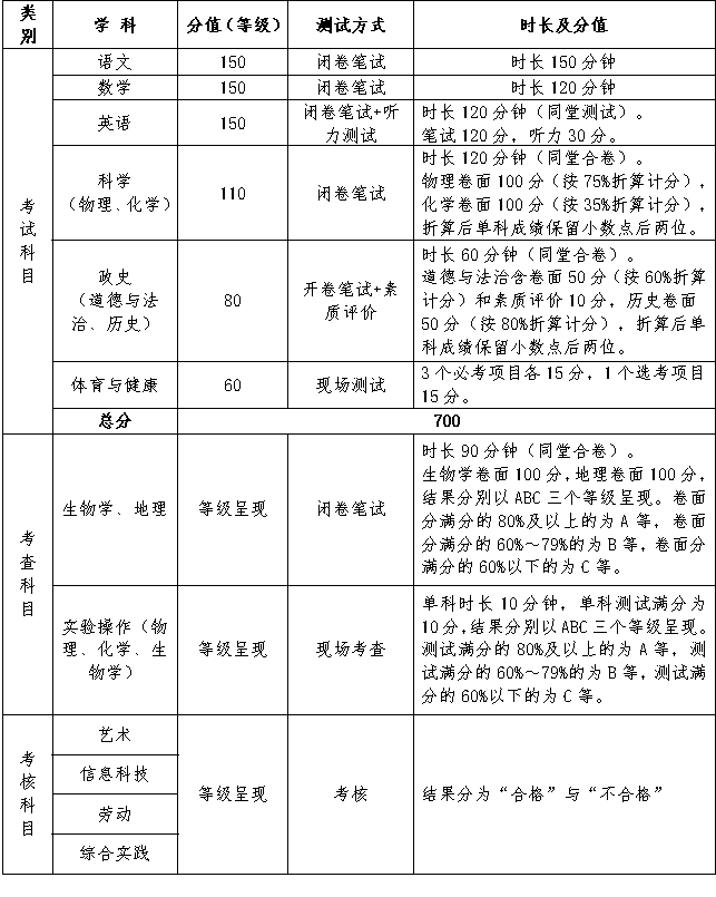 绵阳这份关于中考改革的征求意见稿,中考计分科目取消了生物、地理、实验操作,降低了物理、化学、体育的总分,中考总分从900分降为700分,高中招生录取的科目只有:语文、数学、英语、政史、科学、体育与健康。