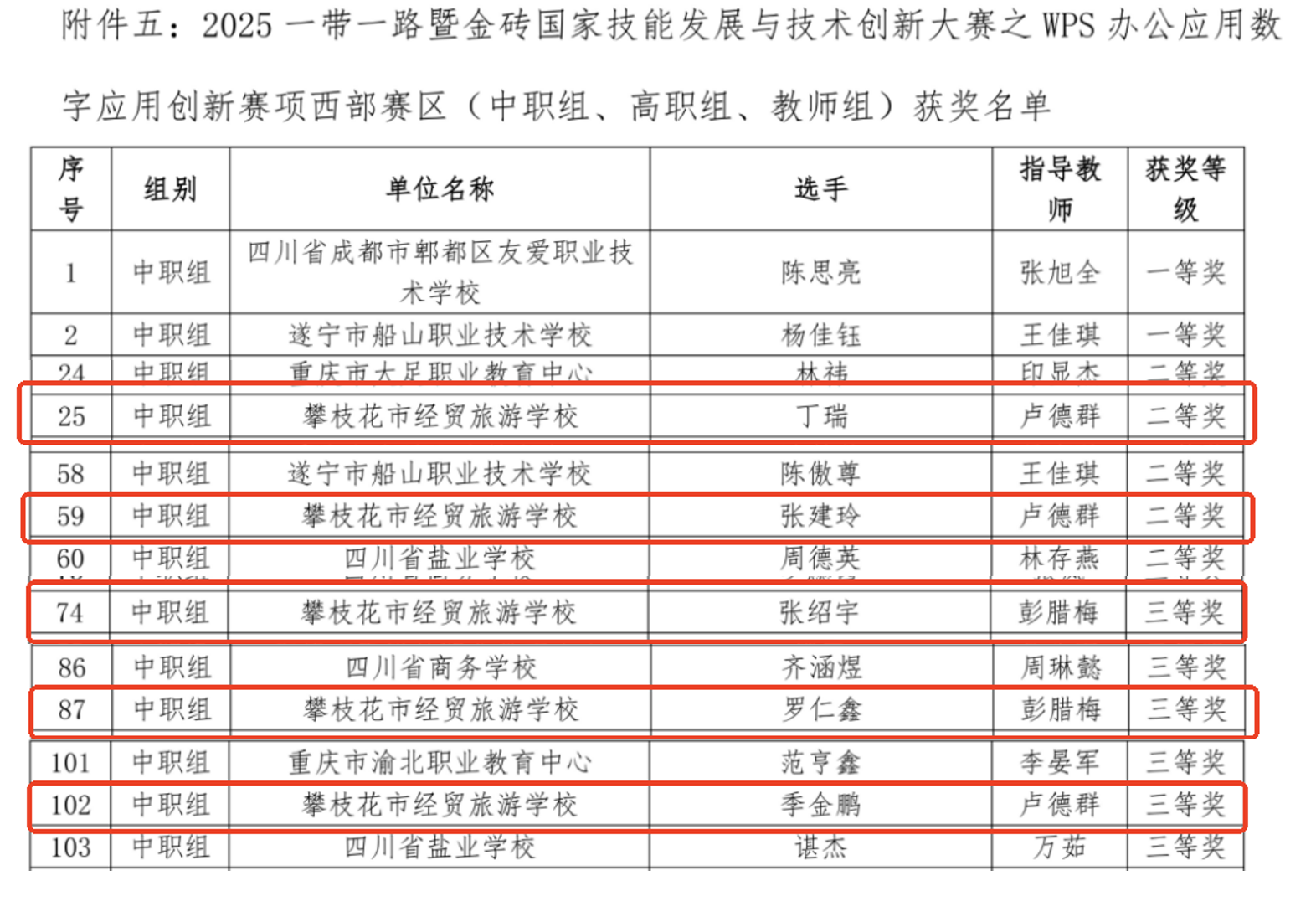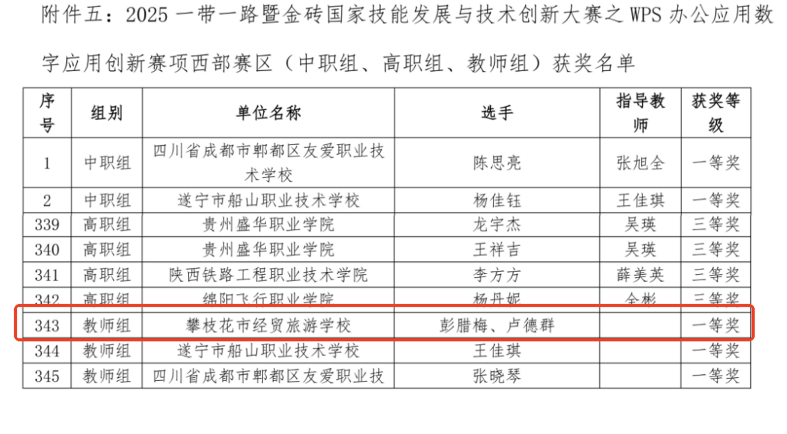 近日,2025第九届 一带一路暨金砖国家技能发展与技术创新大赛之WPS办公应用数字应用创新赛项西部赛区选拔赛圆满收官。市经贸旅游学校积极组织师生参赛,共荣获一等奖1项、二等奖2项、三等奖3项以及优秀奖1项,并有4名师生成功晋级全国总决赛。