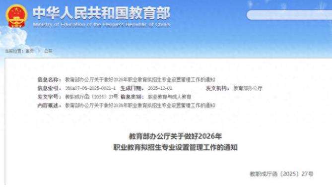 近日,教育部网站发布《教育部办公厅关于做好2026年职业教育拟招生专业设置管理工作的通知》。