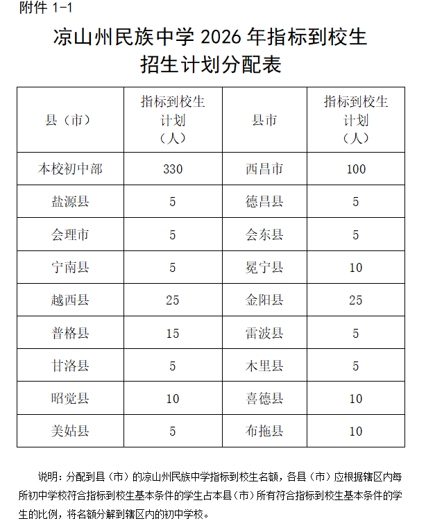 (二)凉山州直属普通高中学校的指标到校生名额由州教育体育局下达州直属普通高中学校本校初中部和全州各县(市),分配到县(市)名额由各县(市)教育主管部门根据辖区内符合指标到校生基本条件初中毕业生人数,按比例分配到本县(市)辖区内的所有初中学校。