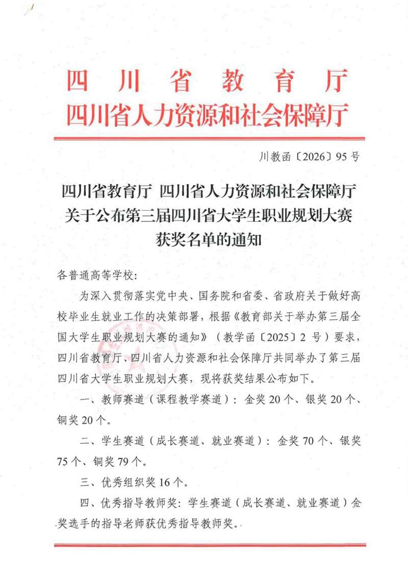 近日,四川省教育厅、四川省人力资源和社会保障厅联合公布第三届四川省大学生职业规划大赛获奖结果,四川工商学院斩获课程教学赛道省级银奖、学生成长赛道省级铜奖,获奖数量与质量位居省内同类院校前列。